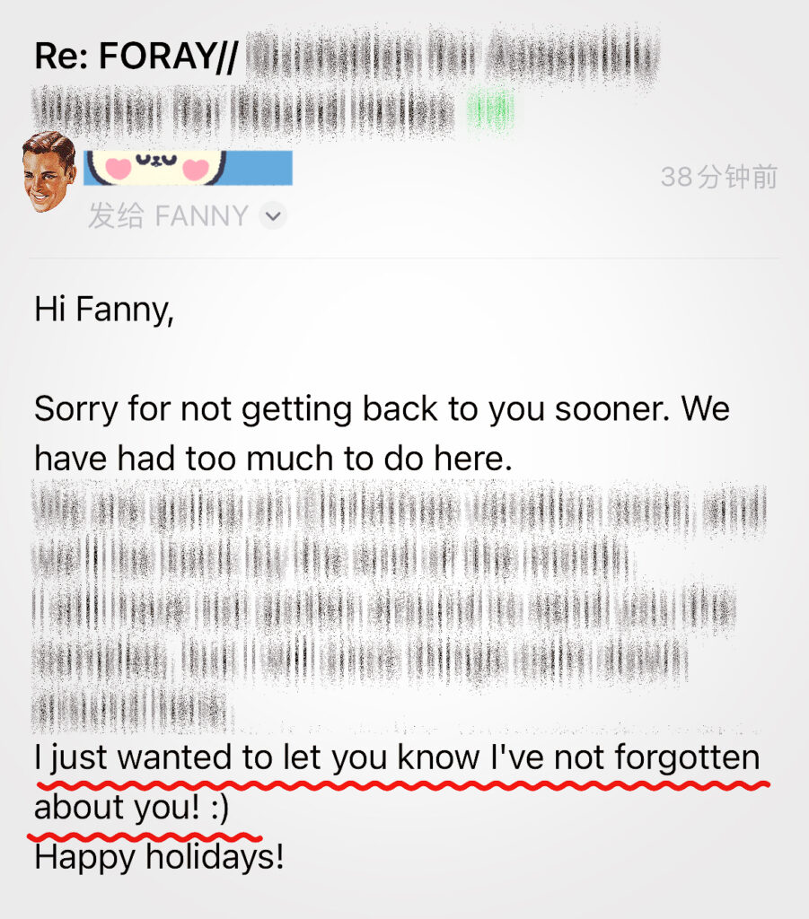Yeaterday, a heartwarming email landed in our inbox. Our client thoughtfully explained that the sample shipment would be arranged promptly after the Christmas holiday. He also added a lovely note to reassure us: his lack of communication lately was by no means a sign of forgetting us, but merely a result of being swamped with year-end workload.